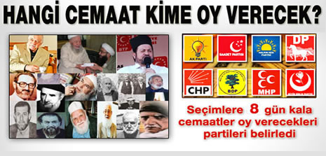 Seçimlere 8 gün kala cemaatler de oy verecekleri partileri belirlemeye başladı. Türkiye'nin en büyük cemaatlerinden biri olan Gülen cemaati oyunu Ak Parti'ye verirken, İsmailağa cemaatinde ibre Saadet Partisi'ni gösteriyor. Yeni Asyacılar da ise ibre istemeden de olsa AK Parti'den yana...