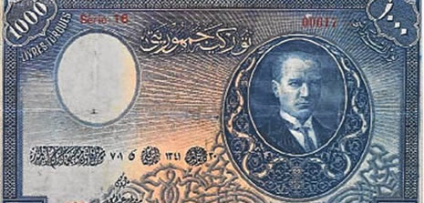 Tedavülden çekildiğinde 23 tanesi Merkez Bankasına dönmeyen Osmanlıca yazılı banknotlardan biri, 250 bin liradan müzayedeye çıkarıldı. Antik AŞ tarafından 5 Aralık Pazar günü Swissotel'de düzenlenecek müzayedede değerli birçok tablo ve eşyanın yanında, en nadir ve değerli Türk parası olan 1. Emisyon 1000 lira da (1927-İngiltere basımı) satılacak.