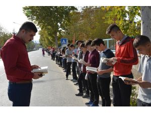 Tokat'ın Zile ilçesinde düzenlenen etkinlikte 4 bin 200 öğrenci, vatandaşların da katılımıyla yaklaşık 3 kilometre uzunluğunda okuma zinciri oluşturuldu.