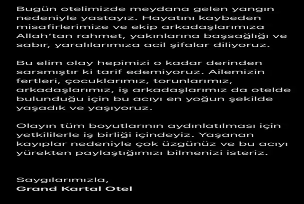 Kaybedilen 76 canla tüm Türkiye'nin yüreğini yakan olayla ilgili Grand Kartal Otel yönetiminden ilk açıklama geldi. Otelin sosyal medya hesabından yapılan paylaşımda "Bugün otelimizde meydana gelen yangın nedeniyle yastayız. Hayatını kaybeden misafirlerimize ve ekip arkadaşlarımıza Allah'tan rahmet, yakınlarına başsağlığı ve sabır, yaralılarımıza acil şifalar diliyoruz. Bu elim olay hepimizi o kadar derinden sarsmıştır ki tarif edemiyoruz. Ailemizin fertleri, çocuklarımız, torunlarımız, arkadaşlarımız, iş arkadaşlarımız da otelde bulunduğu için bu acıyı en yoğun şekilde yaşadık ve yaşıyoruz. Olayın tüm boyutlarının aydınlatılması için yetkililerle iş birliği içindeyiz. Yaşanan kayıplar nedeniyle çok üzgünüz ve bu acıyı yürekten paylaştığımızı bilmenizi isteriz" ifadelerine yer verildi.