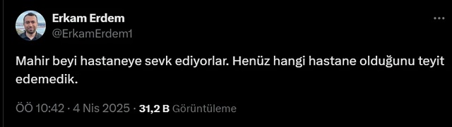 Silivri'deki Marmara Cezaevi'nde tutuklu bulunan İBB Genel Sekreter Yardımcısı Mahir Polat hastaneye sevk edildi. Erdem, sosyal medya hesabından yaptığı paylaşımda Mahir Polat'ın henüz hangi hastaneye kaldırıldığı bilgisine sahip olmadıklarını belirterek, "Mahir beyi hastaneye sevk ediyorlar. Henüz hangi hastane olduğunu teyit edemedik" ifadelerini kullandı.