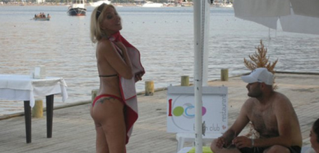 Normalde bikiniyle bile utanarak poz veren sanatçı bu kez akşam saatlerinde plajın tenhalaşmasını fırsat bilip, kırmızı tangasıyla güneşlenirken objektiflere yakalandı.