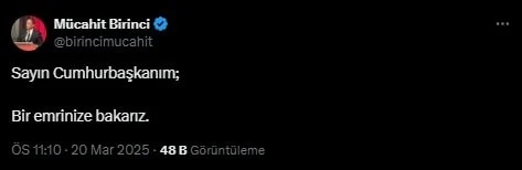Ekrem İmamoğlu'nun gözaltına alınmasının ardından Türkiye'nin farklı yerlerinde sokağa çıkan vatandaşların kitlesel eylemlerine AKP'li eski milletvekili Mücahit Birinci provokatif içerikli bir paylaşım yaptı. Saraçhane'ye tepki göstermek için akan binlerce vatandaşı doğrudan tehdit eden Birinci Cumhurbaşkanı'na hitap ederek 'Bir emrinize bakarız' diye yazdı.