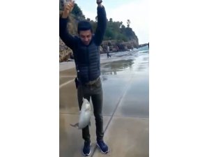 Antalya'da sabah saatlerinde etkili olan sağanak yağmur yerini bir süre sonra parçalı bir havaya bıraktı. Havanın zaman zaman güneş açmasını değerlendiren 3 genç, Lara bölgesinde bulunan bir plaja inerek balık tutmak istedi. Gençlerin bir süre sonra oltası bir balık tarafından çekilmeye başladı. Oltayı kontrol etmekte zorlanan bir gence diğer erkek arkadaşı yardım ederek kıyıya çektiği balığı eli ile yukarı asıldı.