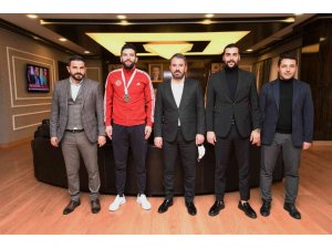 Başkan Ertuğrul Çetin, Ukrayna'nın Kiev şehrinde yapılan Avrupa Karma Dövüş Sanatları (MMA) Şampiyonası'nda altın madalya ile dönen milli sporcu Ahmet Rasim Pala ve Türkiye MMA Federasyon Asbaşkanı Serdar Gökkaya'yı makamında ağırladı.