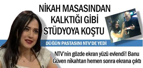 Banu Güven ile Aykut Dokur, Şişli Evlendirme Dairesi'nde nikah masasına oturdu. "Banu Güven'le +" programını sunduktan sonra NTV Haber Merkezi'ne gelen Güven, elinde evlilik cüzdanıyla "gelini öpün" diyerek arkadaşlarıyla birlikte mutluluğunu paylaştı.