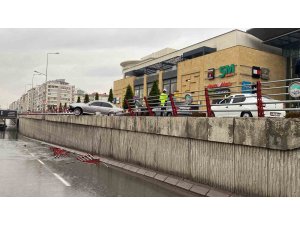 Kayseri'nin Melikgazi ilçesinde bariyerlere çarpan otomobil köprüde asılı kalırken, kazada sürücü yaralandı.