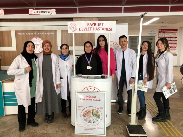 'Türkiye Sağlıklı Beslenme ve Hareketli hayat Programı Yetişkin ve Çocukluk Çağı Obezitesinin Önlenmesi ve Fiziksel Aktivite Eylem Planı" çerçevesinde Bayburt Devlet Hastanesinde görevli diyetisyenlerce stant açıldı.