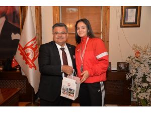 Belediye Başkanı Selim Yağcı, ziyaret sonunda sporculara hediyeler taktim ederek fotoğraf çektirdi.