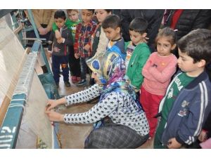Manisa'nın Salihli ilçesindeki Bintepeler Anaokulu öğrencileri belediyenin sosyal sorumluluk projeleri kapsamında çalışmalarını sürdüren halı atölyesini ziyaret ederek, halıların nasıl dokunduğunu gördü.