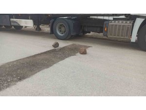 Eskişehir'de bir yol üzerindeki çukuru belli etmek üzere konulan iki büyük taş sürücüler için tehlike olurken, hasarlı alan onarılmayı bekliyor.