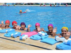 Bozüyük'te yüzme kursuna katılan minikler yazın bunaltıcı sıcağında serinleyerek yüzme öğreniyor.