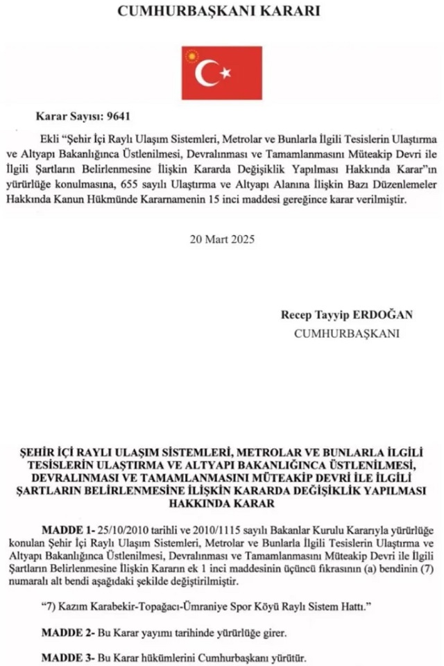 Kazım Karabekir-Topağacı-Ümraniye Spor Köyü Raylı Sistem Hattı, Bakanlık tarafından yürütülecek. Değişiklik, ilgili kararnamenin 3. maddesinin (a) bendinin (7) alt bendi olarak güncellendi. Karar, 20 Mart 2025 itibarıyla yürürlüğe girdi.