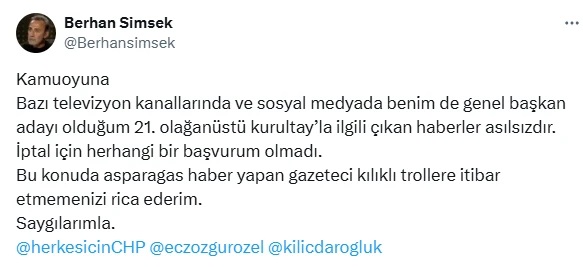 "Kamuoyuna Bazı televizyon kanallarında ve sosyal medyada benim de genel başkan adayı olduğum 21. Olağanüstü Kurultay’la ilgili çıkan haberler asılsızdır. İptal için herhangi bir başvurum olmadı. Bu konuda asparagas haber yapan gazeteci kılıklı trollere itibar etmemenizi rica ederim. Saygılarımla".
