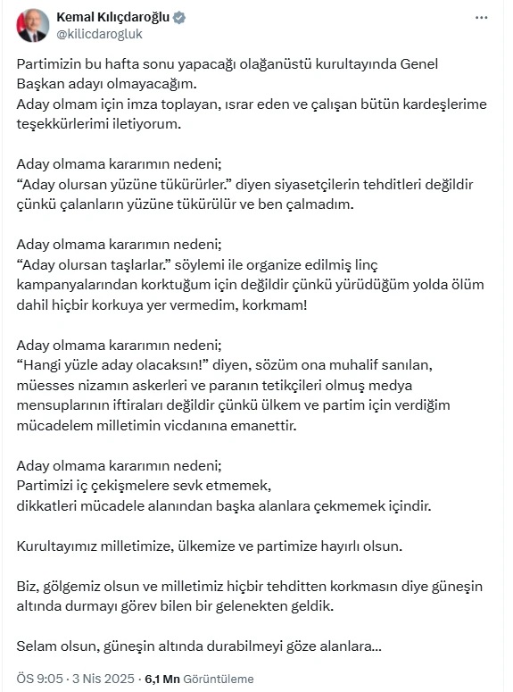 "Demokrasiye katkı sunmak, olağanüstü koşullarda gittiğimiz olağanüstü kurultayımızdan güçlü bir demokrasi ve birliktelik mesajı vermek için Cumhurbaşkanlığı adayımız Sayın Ekrem İmamoğlu'nu esaretten kurtarmak için CHP'mizin bu olağanüstü demokratik takımüllerden kurtarması yönetmesi için Türkiye'mizi kurucu değerlerimiz üzerinden yeniden inşa etmek üzere göreve atılmak için içinde ortam koşullarını adaylığımı açıklıyorum."