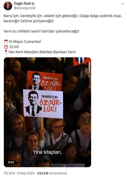 Özel, X hesabından yaptığı paylaşımda ise "Barış için, kardeşlik için, adalet için geleceğiz. Dalga dalga aydınlık olup, karanlığın üstüne yürüyeceğiz! Yarın bu milletin sesini Van’dan yükselteceğiz!" ifadelerini kullandı.