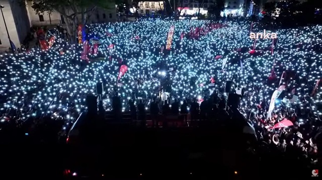 Özel meydanın karartılmasına tepki göstererek konuşmasına Volkan Konak'ın seslendirdiği "Yiğidim Aslanım" türküsü ile devam etti. Özel meydanda toplanan vatandaşlardan telefonlarının ışıklarını açmasını istedi.
