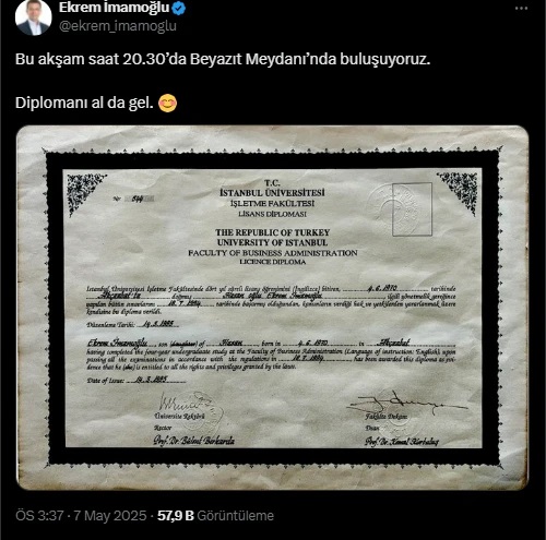 Bu akşam yapılacak miting için İBB Başkanı Ekrem İmamoğlu da sosyal medya hesabından çağrıda bulundu. İmamoğlu, "Bu akşam saat 20.30’da Beyazıt Meydanı’nda buluşuyoruz. Diplomanı al da gel" dedi.