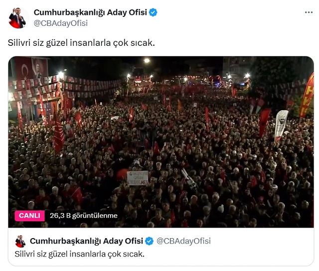 Mitingin başladığı dakikalarda tutuklu İBB Başkanı Ekrem İmamoğlu adına açılan "Cumhurbaşkanlığı Aday Ofisi @CBAdayOfisi" adlı X hesabından "Silivri siz güzel insanlarla çok sıcak" notuyla alandan yapılan canlı yayın paylaşıldı.