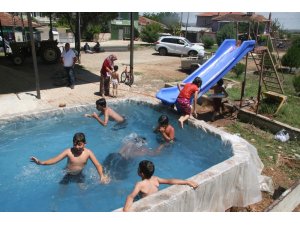 Denizli'de sıcaktan bunalan çocuklar, köy meydanına yapılacak olan ancak inşaatı tamamlanamayan süs havuzunun inşaatını kendi imkanlarıyla yüzme havuzuna çevirip bir de kaydırak yaptı.