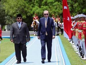 Endonezya Cumhurbaşkanı Subianto, Erdoğan'ı giriş kapısında karşıladı. Erdoğan ve Subianto'nun tören alanındaki yerlerini almasının ardından, askeri bando iki ülkenin milli marşlarını çaldı, top atışı yapıldı.