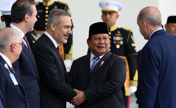 Bogor Cumhurbaşkanlığı Sarayı'ndaki karşılama töreninde Erdoğan ve Subianto, heyetlerini birbirlerine takdim etti.