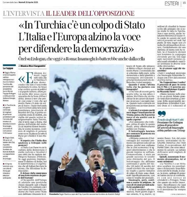 Corriere Della Sera'ya konuşan CHP Genel Başkanı Özgür Özel, "Ekrem İmamoğlu, Erdoğan'ı hapisten de yener" dedi. Özel röportajında, "Erdoğan bugün Türkiye'de demokrasi olduğunu ve gerici bir dönüş olmadığını söyleyecek. Eğer politikacıları ve İtalyan halkını buna inandırmayı başarırsa, o zaman Pisa Kulesi'nin dik olduğunu da yalanlanmadan söyleyebilecektir. Aksine, eğildiği doğrudur, tıpkı ülkemizde bir darbe olduğunun doğru olduğu gibi" ifadelerini kullandı.