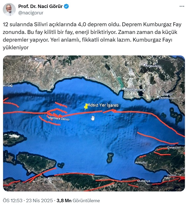Prof. Dr. Naci Görür, X hesabından, "12 sularında Silivri açıklarında 4,0 deprem oldu. Deprem Kumburgaz Fay sonunda. Bu fay kilitli bir fay, enerji biriktiriyor. Zaman zaman da küçük depremler yapıyor. Yeri anlamlı, dikkatli olmak lazım. Kumburgaz Fayı yükleniyor" ifadelerini kullandı.