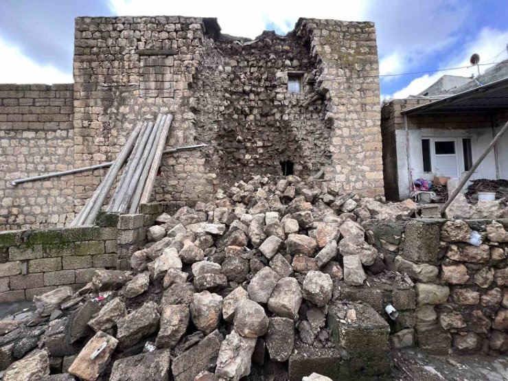 Mardin'de, Kahramanmaraş merkezli depremlerde ağır hasar alan eski ev, şiddetli yağışta yıkıldı.