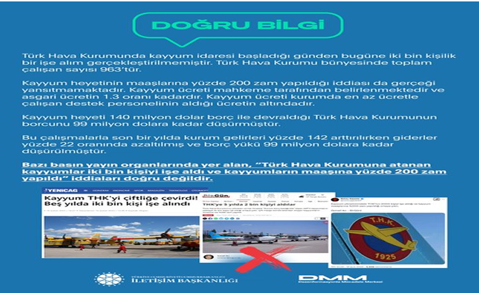 İletişim Başkanlığı Dezenformasyonla Mücadele Merkezi'nin (DMM) sosyal medya hesabından, bazı basın yayın organlarında yer alan, "Türk Hava Kurumuna atanan kayyumlar iki bin kişiyi işe aldı ve kayyumların maaşına yüzde 200 zam yapıldı" iddialarına ilişkin açıklama yapıldı.