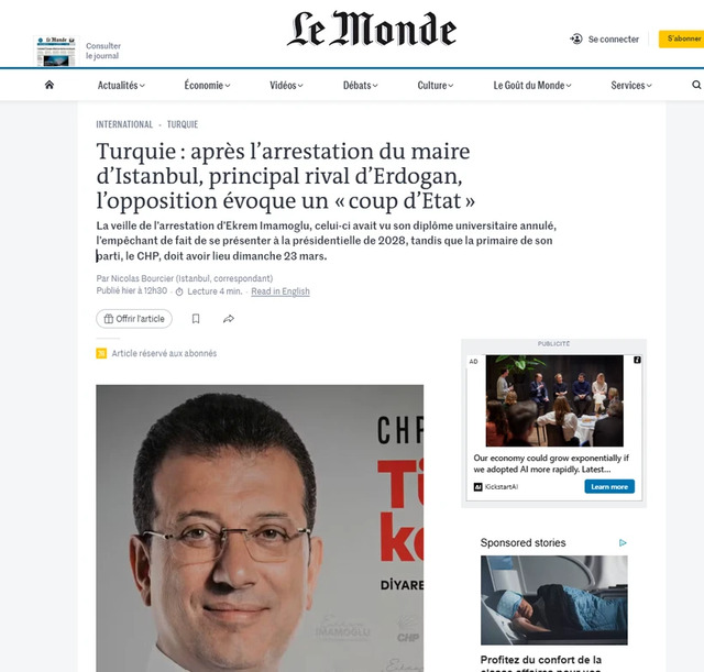 İstanbul Büyükşehir Belediye Başkanı ve Erdoğan'ın rakibi Ekrem İmamoğlu "yolsuzluk" ve "terör bağlantısı" suçlamasıyla tutuklandı. Muhalefet, Cumhurbaşkanının karşısına çıkacak olan İmamoglu'nun gözaltına alınmasını "darbe" olarak kınıyor.