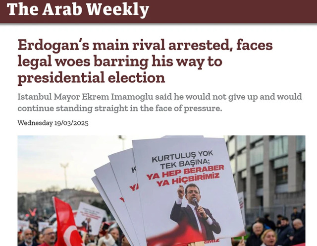 Türkiye: Erdoğan'ın baş rakibi İstanbul Büyükşehir Belediye Başkanı Ekrem İmamoğlu'nun gözaltına alınması ardından muhalefet "darbeden" söz ediyor. İmamoğlu'nun gözaltına alınmadan bir gün önce üniversite diploması iptal edilerek 2028 Cumhurbaşkanlığı seçimlerine katılması fiilen engellenmiş oldu. Partisinin ön seçimleri ise 23 Mart Pazar günü yapılacak olan CHP'de yapılacak.