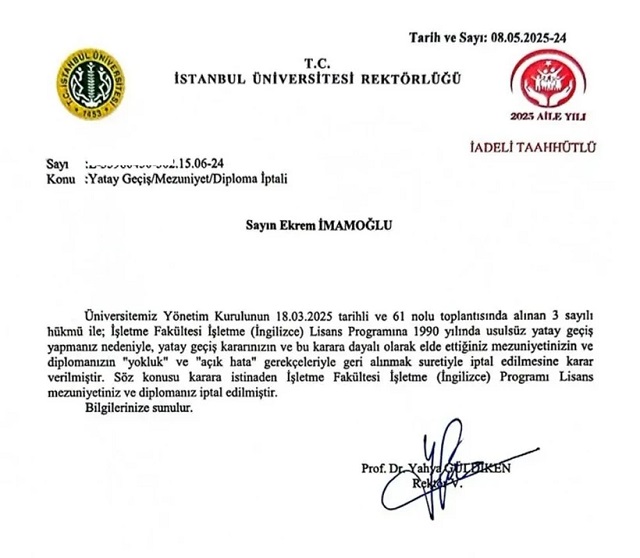 "Üniversitemiz Yönetim Kurulu'nun 18.03.2025 tarihli toplantısında alınan hükmü ile; İşletme Fakültesi İşletme (İngilizce) Lisans Programına 1990 yılında usulsüz yatay geçiş yapmanız nedeniyle, yatay geçiş kararınızın ve bu karara dayalı olarak elde ettiğiniz mezuniyetinizin ve diplomanızın 'yokluk' ve 'açık hata' gerekçeleriyle geri alınmak suretiyle iptal edilmesine karar verilmiştir."