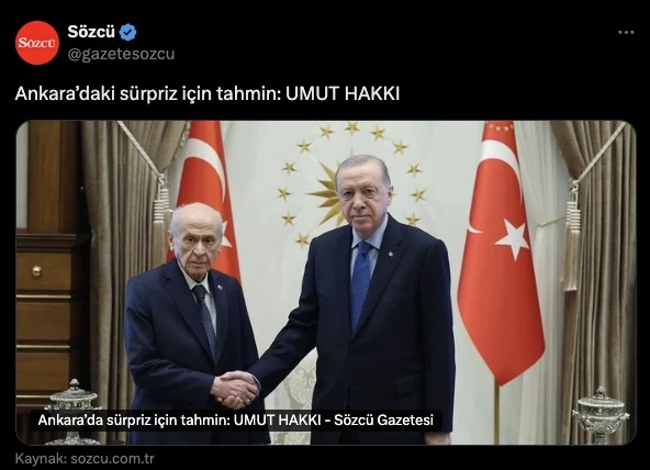 Öte yandan dün Erdoğan, MHP Genel Başkanı Devlet Bahçeli’yi kabul etti. Beştepe’deki görüşme, basına kapalı gerçekleşti. Sözcü'de yer alan habere göre kulislerde Erdoğan’ın “umut hakkı” ile ilgili bir açıklama yapacağı konuşuldu. Gazeteci, yazar Murat Yetkin, Cumhurbaşkanı Tayyip Erdoğan'ın cumartesi günü yapacağı açıklanan "önemli konuşma"ya ilişkin, gündeme gelen konuları ele aldı. Yetkin, "Siyasi af gündeme gelir mi?" sorusuna dün yanıt aradı.