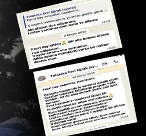“Fecri bey selamlar, nasılsınız. Çalışma hayatında iş yerinize geldik, gittik. Beraber Telateks fabrikada projede kafa yorduk. Az da olsa ekmek yedik çay içtik beraber. Evet haklısınız maalesef tatsız bir konuyla rahatsız ettim sizi affedin. Sizin kişiliğinizi tanımasam, mecbur kalmasam kapınızı çalar mıydım? Lütfen sizden rica ediyorum eğer mümkünü varsa bana 2 aylığına 30-35 bin TL destek verin. Bugünlerde geçecek elbet. Durumumu önce Allah’a sonra size arz/rica ediyorum”.