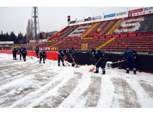 Eskişehir Atatürk Stadyumu'nda 28 Ocak'da oynanacak olan Bursaspor maçı öncesinde kar temizliği devam ediyor.