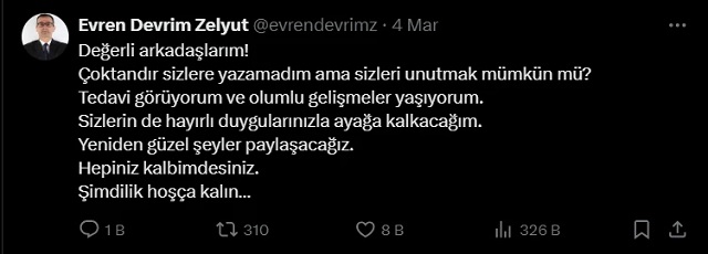 "Değerli arkadaşlarım! Çoktandır sizlere yazamadım ama sizleri unutmak mümkün mü? Tedavi görüyorum ve olumlu gelişmeler yaşıyorum. Sizlerin de hayırlı duygularınızla ayağa kalkacağım. Yeniden güzel şeyler paylaşacağız. Hepiniz kalbimdesiniz. Şimdilik hoşça kalın…"