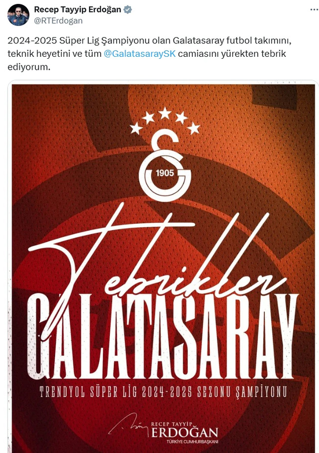 2024-2025 Süper Lig Şampiyonu olan Galatasaray futbol takımını, teknik heyetini ve tüm @GalatasaraySK camiasını yürekten tebrik ediyorum.