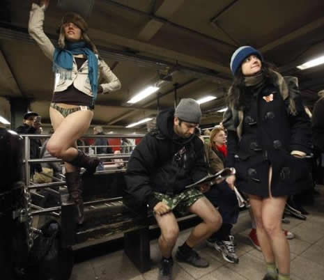 Bu yıl 9'uncusu düzenlenen 'Metroda Pantolonsuz Yolculuk' eylemine katılan kadınlı erkekli 3 bini aşkın insan, metroya bindikten sonra, vagonlarda ya da istasyonlarda pantolonlarını çıkardı.