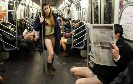 Bu yıl 9'uncusu düzenlenen 'Metroda Pantolonsuz Yolculuk' eylemine katılan kadınlı erkekli 3 bini aşkın insan, metroya bindikten sonra, vagonlarda ya da istasyonlarda pantolonlarını çıkardı.
