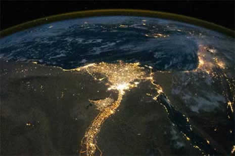 Fotoğraftaki ışıklı yer Mısır'ın Kahire kenti. Işıklar Nil Nehri boyunca ilerliyor. Üst tarafta ise Akdeniz görünüyor.