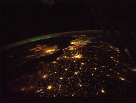 Bu fotoğrafta Avrupa'nın bir bölümü var. Fransa ve sol tarafında İngiltere'nin ışıkları görünüyor. Sol üst köşede ise Kuzey Kutbu'nun ışıklarını görmek mümkün.