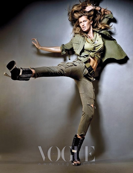 Brezilyalı ünlü top model Gisele Bündchen Kore Vogue'un Mayıs sayısı için asker üniformalarını giydi.