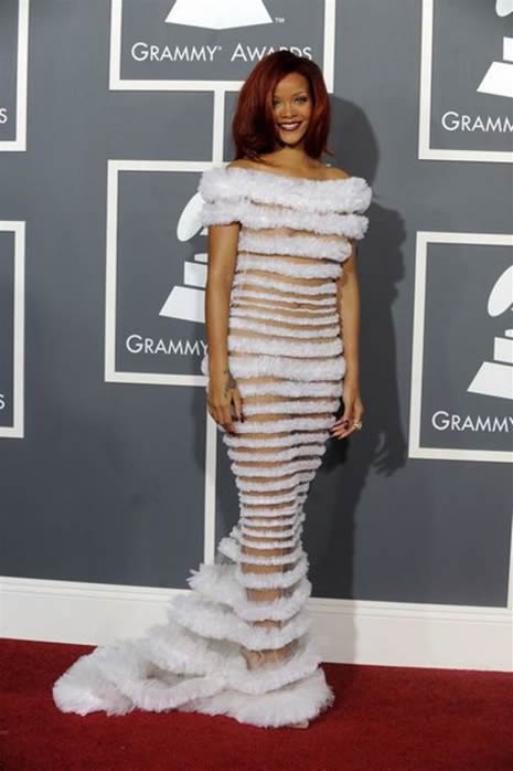 Rihanna şeffaf elbisesiyle Grammy gecesine damgasını vurdu.
