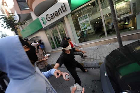 Şişli'deki Ergenekon Caddesi'nde toplanan grup, çeşitli sloganlarla IMF ve Dünya Bankası toplantılarını protesto etti.