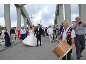 Köprüden geçen çift, araç konvoyuyla nikah için salonun yolunu tuttu.