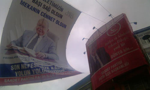Ankara'da vefat eden eski başbakan ve Saadet Partisi Genel Başkanı Necmettin Erbakan'ın cenazesinin, Fatih Camisi'nde musalla taşına konulmasının ardından, Kuran-ı Kerim okunmaya başlandı. Erbakan'ın cenaze namazının kılınacağı caminin avlusu ve yollar, sevenleriyle dolup taştı. Caminin protokol girişi yolunun iki tarafında Saadet Partisi İstanbul Gençlik Kolları üyeleri kol kola girerek bariyer oluşturdu. Bu yol üzerine Saadet Partisi tarafından ''Milletimizin başı sağoğlsun, mekanın cennet olsun'' ve ''Mavi Marmara senin mirasın'' yazılı pankartlar asıldı.