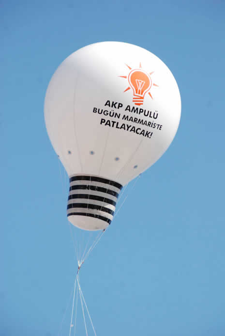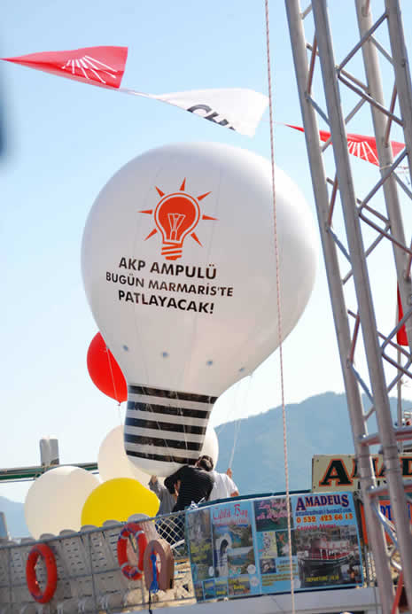 Kemal Kılıçdaroğlu'nun Muğla Marmaris'teki mitingini tamamlamasının ardından, CHP'lilerce hazırlanan AKP Ampulü şeklindeki balon havaya bırakıldı.