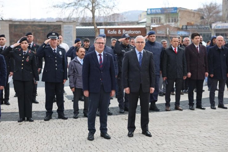Etkinlik Atatürk büstüne çelenklerin konulmasıyla başladı. Kaymakamlık ve belediye başkanlığı çelenklerinin konulmasının ardından şehitler için 1 dakikalık saygı duruşunda bulunularak İstiklal Marşı okundu. Daha sonra ilçe jandarma komutanlığı personeli Uzman Çavuş Talip Kurt, günün anlam ve önemine ilişkin bir konuşma yaptı, ardından Gürdoğanlar çok programlı Anadolu lisesi öğrencilerinden Mert Turhal'da şiir okudu.