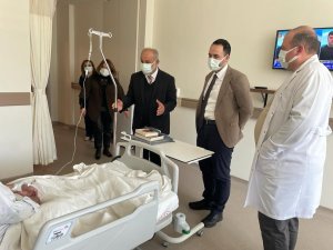 Topcan'a ziyareti sırasında, Hastane Başhekimi Dr. Öğretim Üyesi Fazıl Kulaklı, Dr. Öğretim Üyesi Hasan Mücahit Özbaş ve Din Görevlisi Hayrullah Yavuzyılmaz eşlik etti.